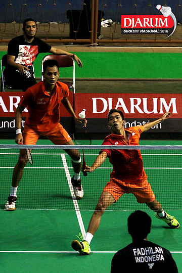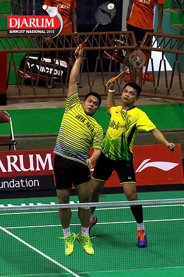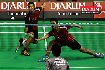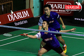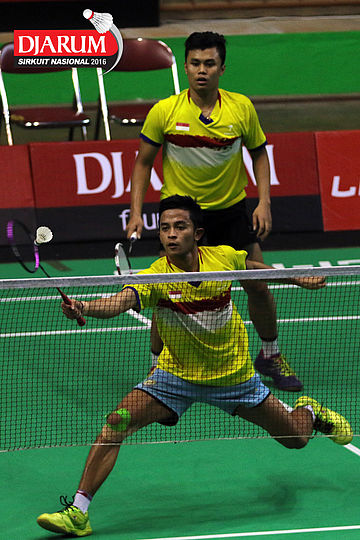 Akbar Bintang/Angger Sudrajat (Djarum Kudus) mengembalikan shuttlecock