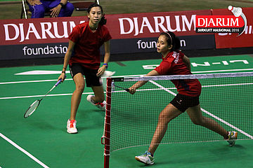 Maria Natalia/Monika Sandia (Putra Mainaky) mengembalikan shuttlecock
