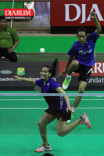 Agripina Primarahmanto/Anneke Feinya (Jaya Raya) mengembalikan shuttlecock