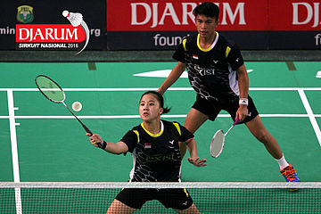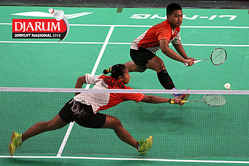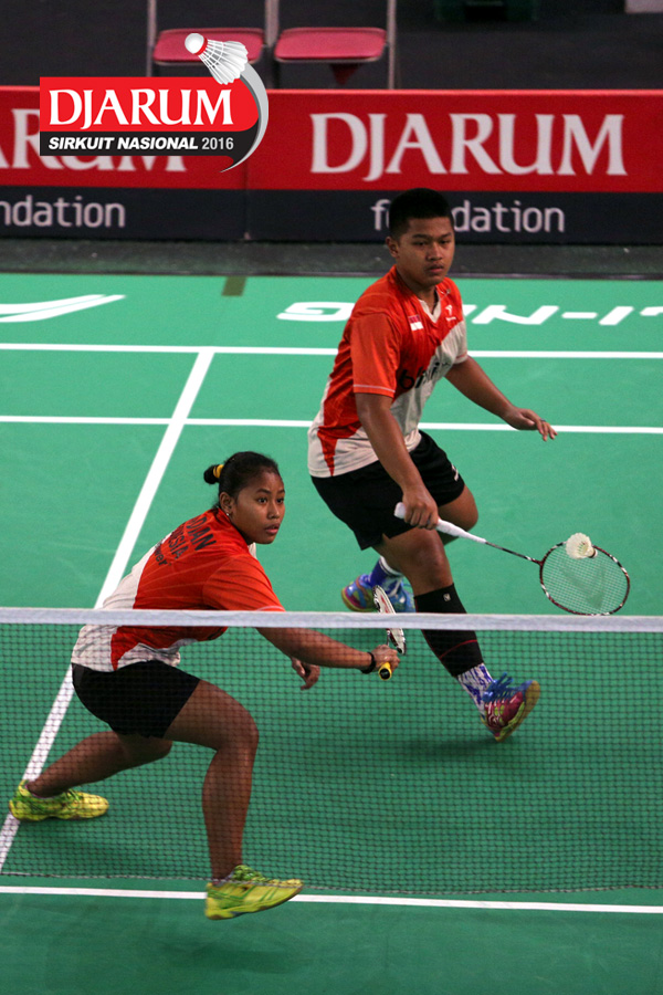 Pramudya Kusumawardana/Lisa Ayu (Djarum Kudus) bersiap menyambar pengembalian tanggung