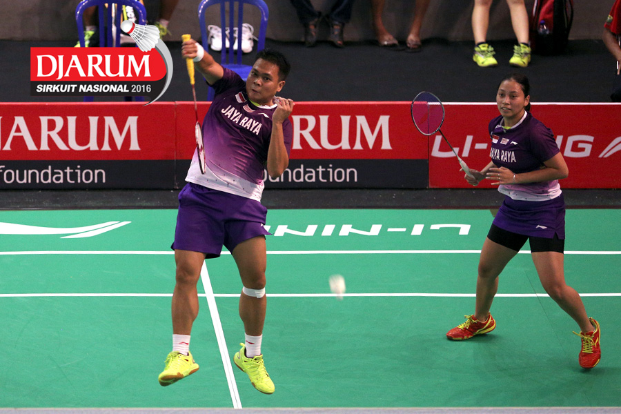 Irfan Fadhillah/Weni Anggraeni (Jaya Raya) mengembalikan shuttlecock