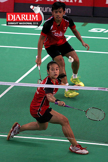 Pramudya Kusumawardana/Lisa Ayu (Djarum Kudus) mengembalikan shuttlecock