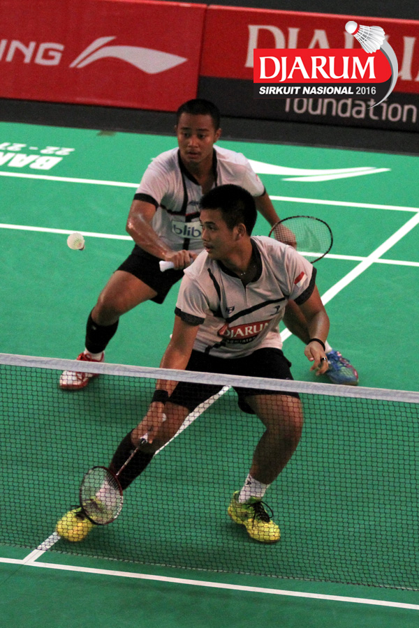 Helmi Abbu/Rehan Naufal (Djarum Kudus) menghadang serangan