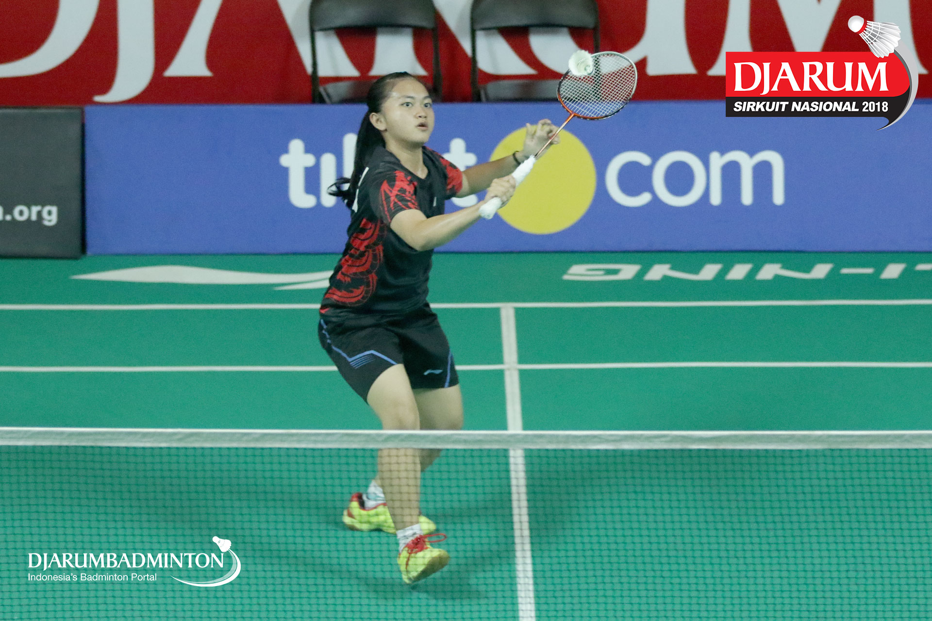 Angel Christabell Mandagi (Cahaya Bulutangkis Nusantara, Batam) bersiap mengembalikan shuttlecock