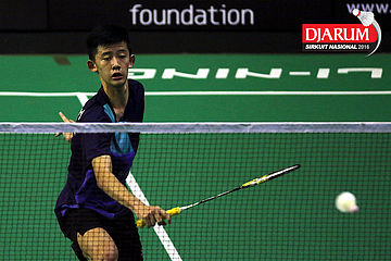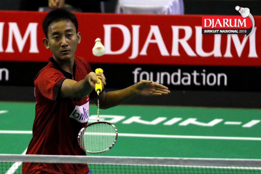 Vero Wisnu (Djarum Kudus) mengembalikan shuttlecock