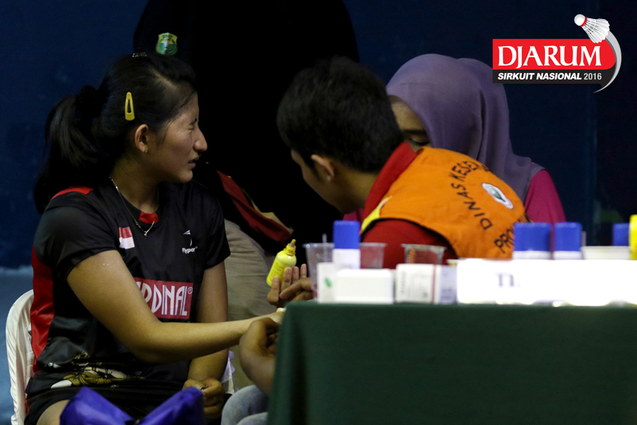 Gebby Ristiyani (Mutiara Cardinal) mendapatkan perawatan medis usai bertanding