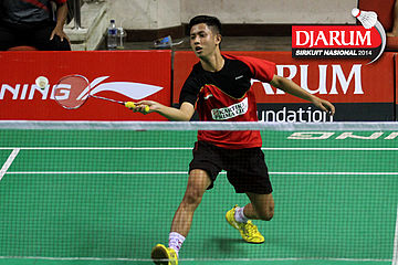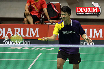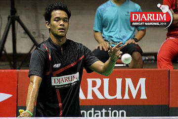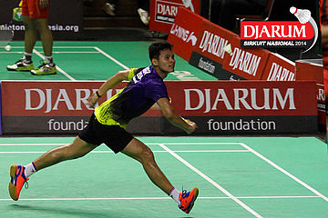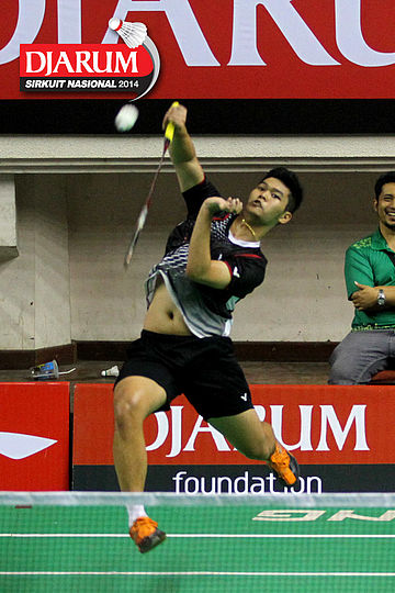 Indra Setiawan (PERTAMINA INDONESIA) mencoba menggapai shuttlecock