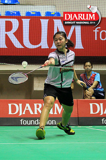 Priskila Siahaya (EXIST JAKARTA) mengembalikan shuttlecock ke arah Mia Mawarti Utami (GUNA DHARMA)