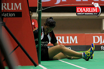 Rianti Dwi Putri (SKO RAGUNAN) terjatuh saat mencoba menggapai shuttlecock
