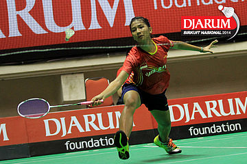 Virny Putri Jafar (JAYA RAYA JAKARTA) mencoba menggapai shuttlecock
