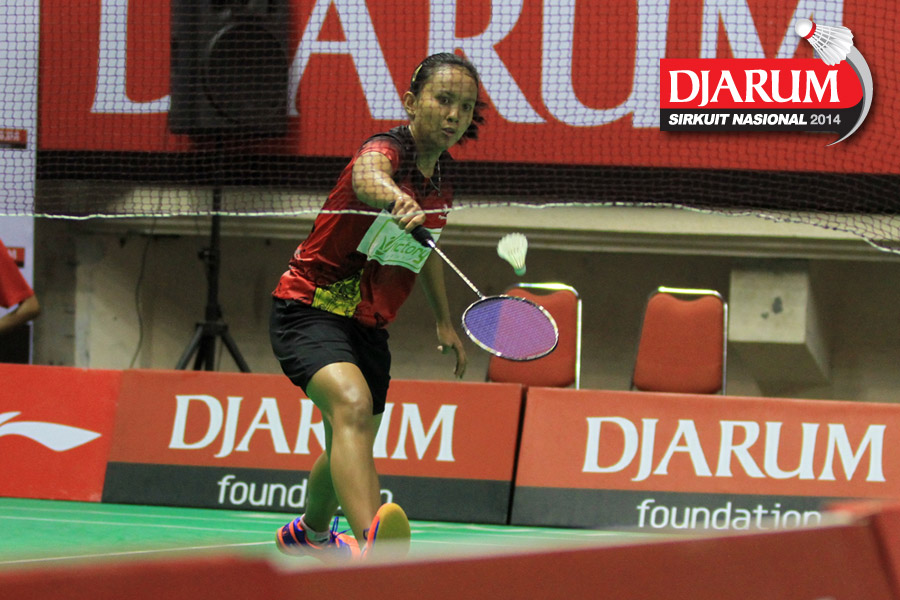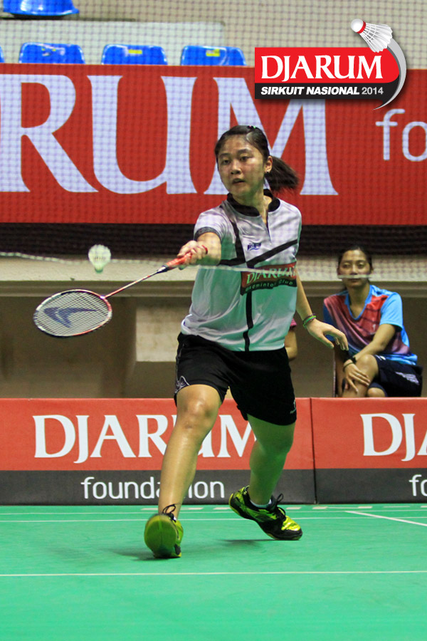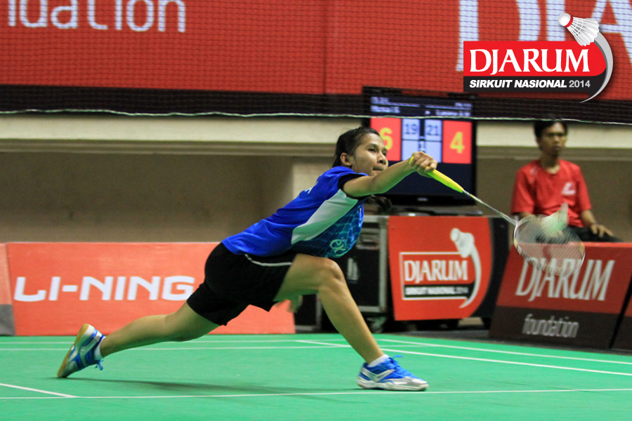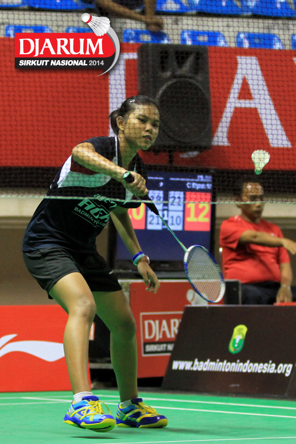Marsa Indah S (DJARUM KUDUS) mengembalikan shuttlecock ke arah Lyanny Alessandra Mainaky (PUTRA MAINAKY)
