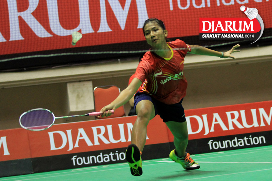 Virny Putri Jafar (JAYA RAYA JAKARTA) mengembalikan shuttlecock ke arah Rianti Dwi Putri (SKO RAGUNAN)