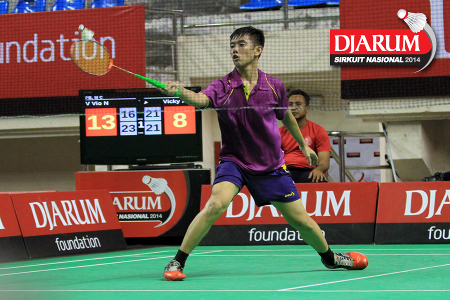 Vicky Angga S (TANGKAS JAKARTA) mengembalikan shuttlecock ke arah Vega Vio N (MUTIARA CARDINAL)
