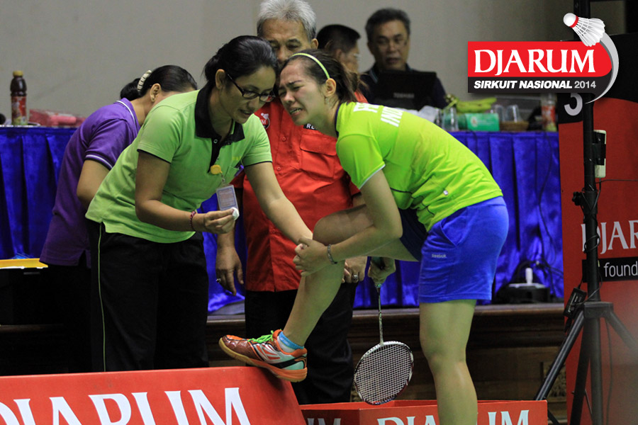 Febby Angguni (TJAKRINDO MASTER) menahan sakit ketika mendapat perawatan medis