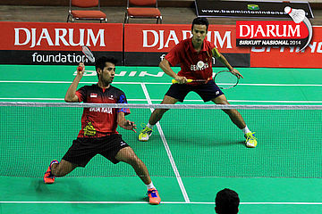 Andika Ramadiansyah/Rinov Rivaldy (DJARUM KUDUS) menghalau serangan Achmad Fasich/Ragawa Tamasuta A (CITRA RAYA/SEMEN GRESIK)