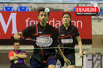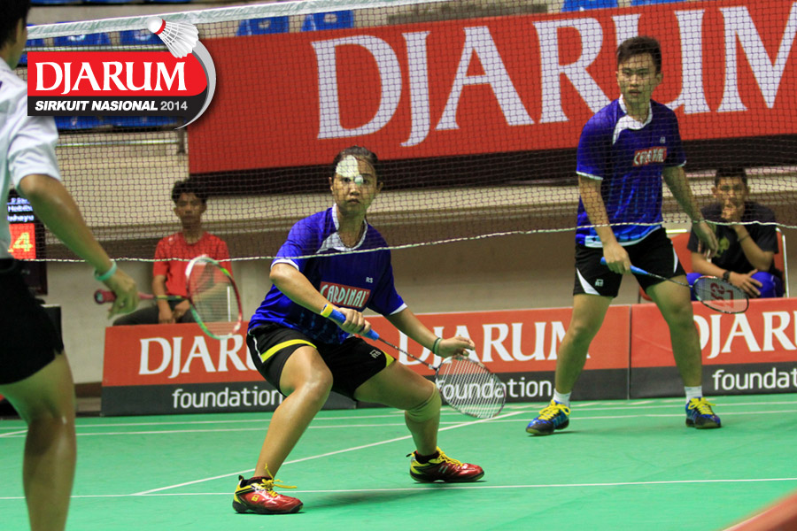 Reinard Dhanriano/Shinta Arum (MUTIARA CARDINAL) mengembalikan shuttlecock ke arah Fauzi Habibi/Apriani Rahayu (PELATPROV DKI JAKARTA)