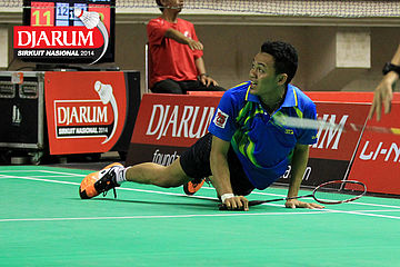 Rizky Hidayat Ismail (HIQUA WIMA) terjatuh saat mencoba menggapai shuttlecock