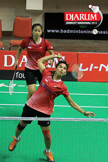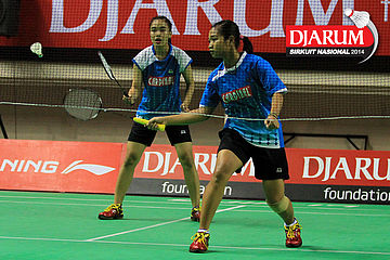 Afiat Yuris Wirawan/Yohanes Rendy Sugiarto (DJARUM KUDUS) menahan smash keras Fran Kurniawan/Agripina Prima R (DJARUM KUDUS/JAYARAYA JAKARTA)