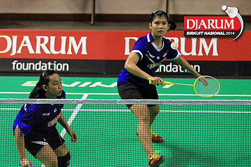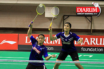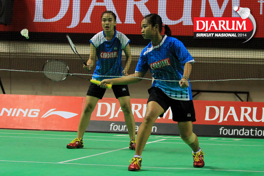 Linda Mutiara Pertiwi/Shinta Arum (MUTIARA CARDINAL) mengembalikan shuttlecock ke arah Dianita Saraswati/Yulfira Barkah (MUTIARA CARDINAL)