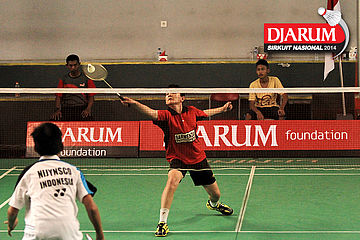 Sopian Agung (PB ABC) mengembalikan shuttlecock ke arah Bima Nugroho (Sarwendah)