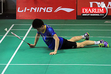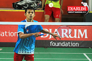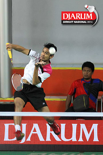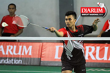 Hermansyah (Jaya Raya) menyambar pengembalian tanggung dari Kho Henrikho (Djarum Kudus)