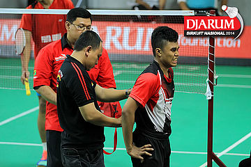 R. Eka Fajar (Jaya Raya) bersiap menyambut pengembalian dari M. Nizar (Pelatprov PBSI DKI Jakarta)