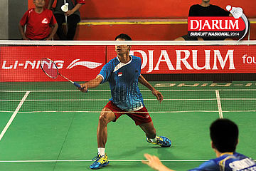 Panji Akbar (Pelatprov PBSI DKI Jakarta) mengembalikan shuttlecock ke arah Senatria Agus (SGS PLN)
