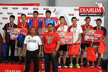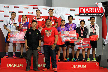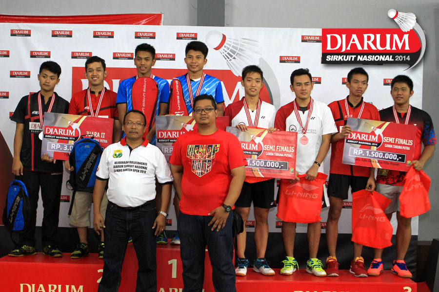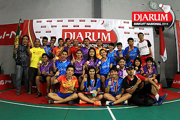 Tim Exist Jakarta berpose bersama usai pembagian hadiah juara Djarum Sirkuit Nasional Li-Ning Banten Open 2014