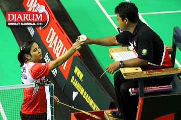 Gregoria Mariska (Pelatnas) saat meminta wasit untuk memeriksa shuttlecock