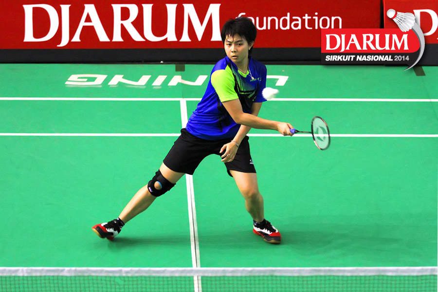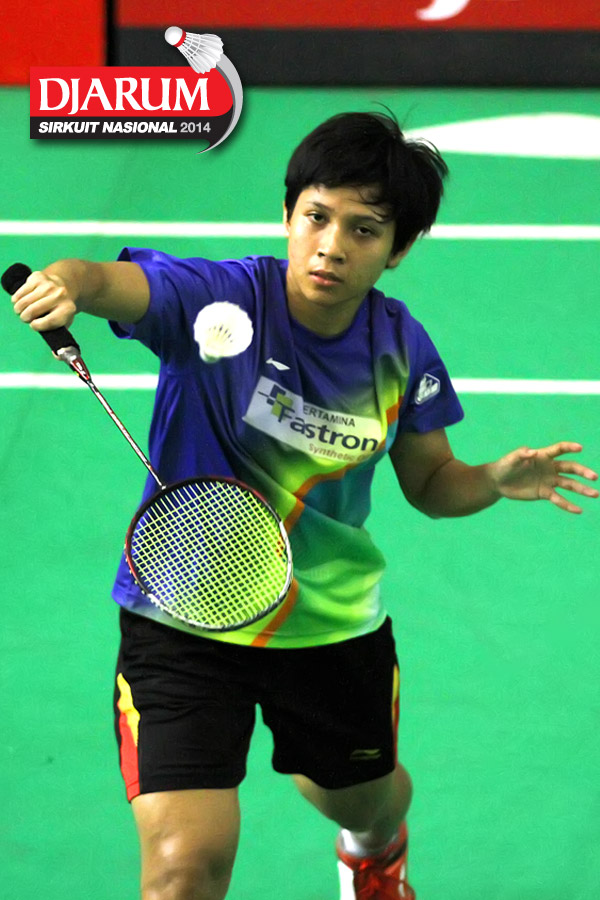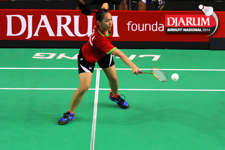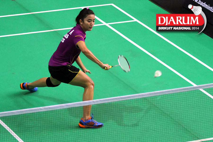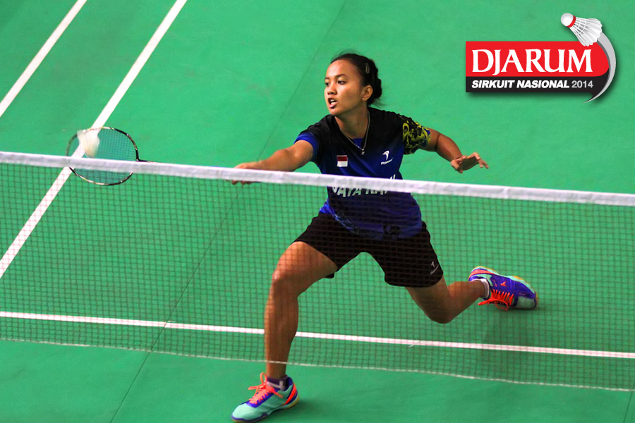 Tike Arieda (Jaya Raya Suryanaga) mengembalikan shuttlecock ke arah Fitriani (Pelatnas)