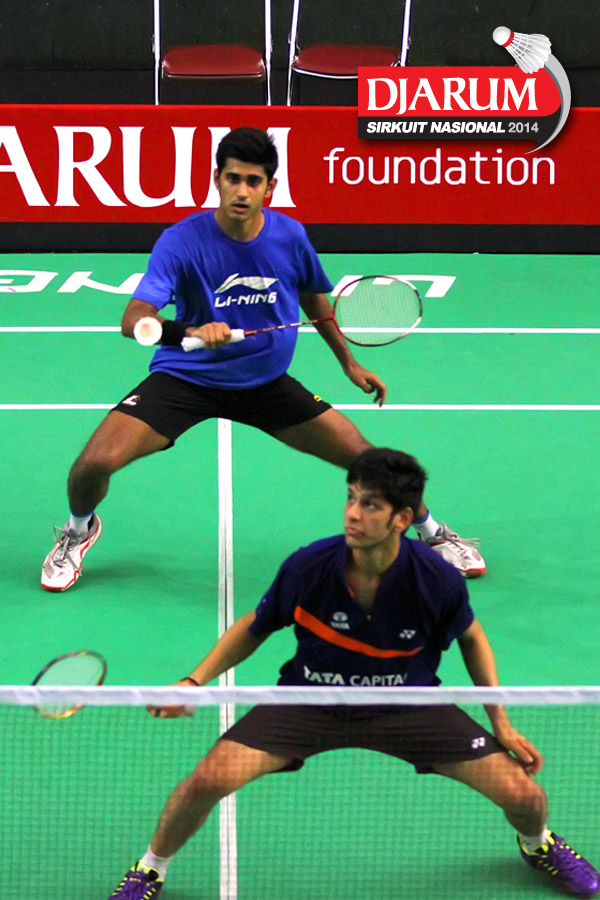 Harsit Aggarwal/Karan Rajan (India) bersiap menyambut pengembalian dari Nanda Adita/Rixy Sirhall (Jaya Raya Suryanaga)