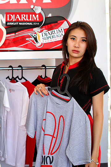 Seorang usher berpose dengan original merchandise Djarum Sirkuit Nasional Li-Ning Jabar Open 2014