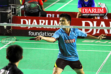Riski Hermawan (Mutiara Bandung) mengembalikan shuttlecock ke arah Tri Cahyo (PB Djarum)