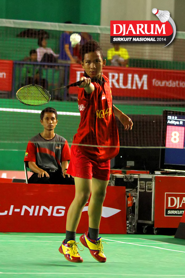 Hengky Nur Oktavian (Jaya Raya) mengembalikan shuttlecock ke arah Miftah Zulfadil (Samudera Jaya)
