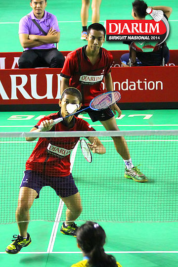 Lucky Lukman/Mita Sani (Citra Raya Unesa) bersiap menyambut pengembalian dari Ridho B/Rahmadhani Putri (PB Djarum)