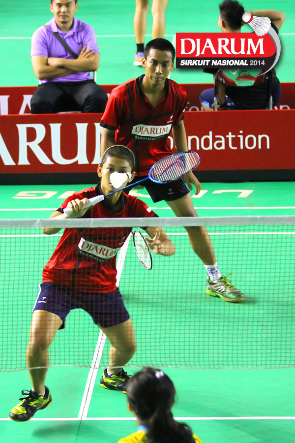 Lucky Lukman/Mita Sani (Citra Raya Unesa) bersiap menghadang serangan yang dilepaskan pasangan Ridho B/Rahmadhani Putri (PB Djarum)