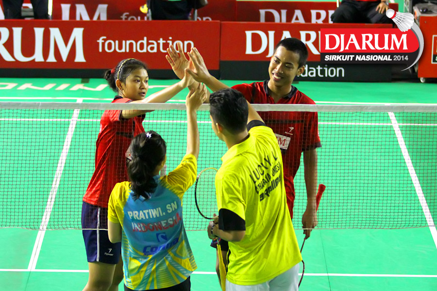 Ridho B/Rahmadhani Putri (PB Djarum) bersalaman dengan Lucky Lukman/Mita Sani (Citra Raya Unesa) usai bertanding