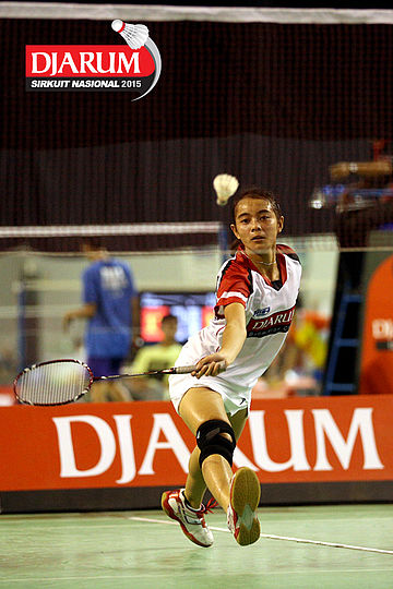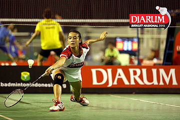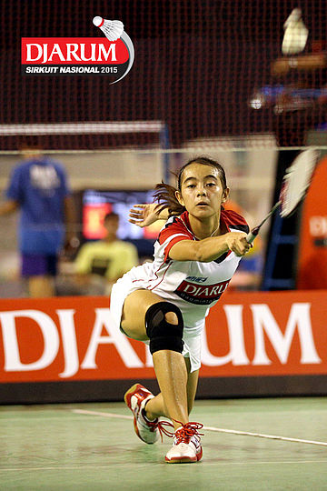 Silvi Wulandari (Djarum Kudus) berusaha menggapai pengembalian dari Choirunnisa (Mutiara Cardinal).