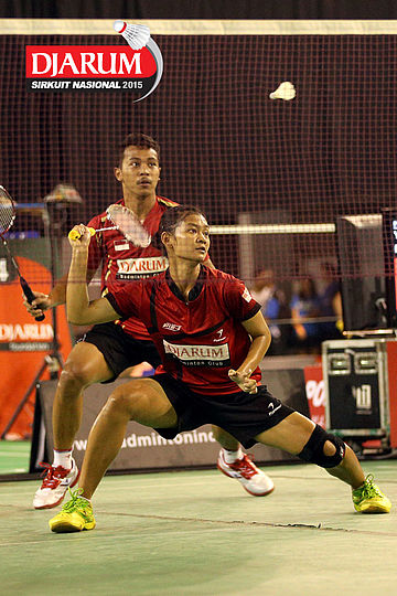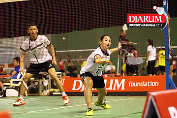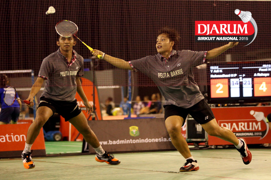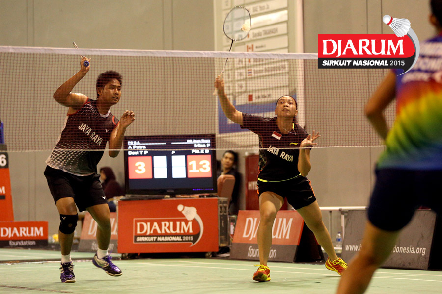 Fauzi Habibie/Apriani Rahayu (Pelita Bakrie) menghadang pengembalian dari Yahya Adi/Ramadhani Putri (Djarum Kudus).