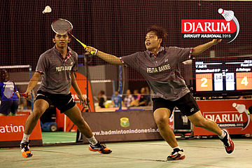 Fauzi Habibie/Apriani Rahayu (Pelita Bakrie) menyambut pengembalian dari Yahya Adi/Ramadhani Putri (Djarum Kudus).