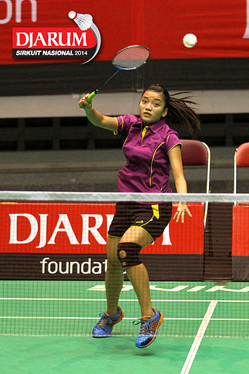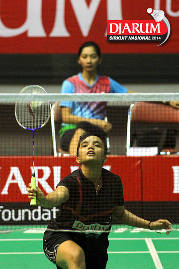 Novalia Agustianti (Tangkas) mengembalikan shuttlecock ke arah Monica Sandiya (Focus).
