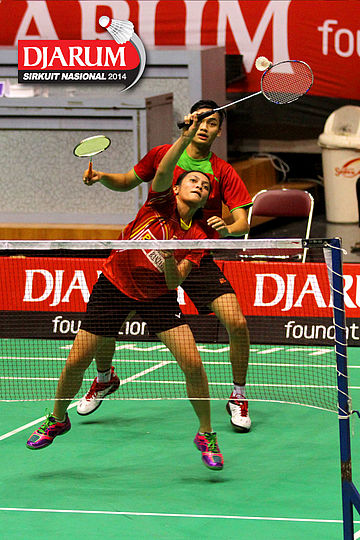Anggun Nugroho/Dian Fitriani (Halim/Pertamina Fastron) menghadang pengembalian dari Wildan Atmaja/Wieke (Guna Dharma).