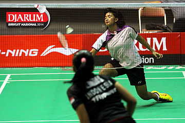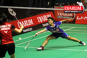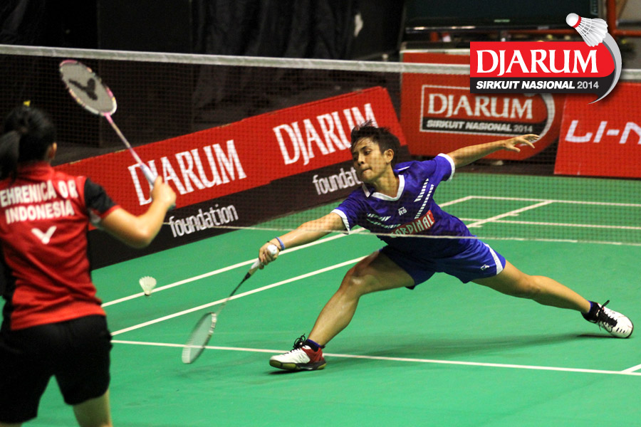 Jauzah Fadhilah (Pelatprov PBSI DKI Jakarta) mengembalikan shuttlecock ke arah Arinda Sari Sinaga (PB Djarum).
