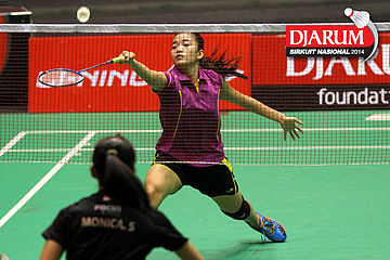 Putri Sekartaji (Mutiara Bandung) berusaha menggapai pengembalian dari Vehrencia Debora (Pelatnas).