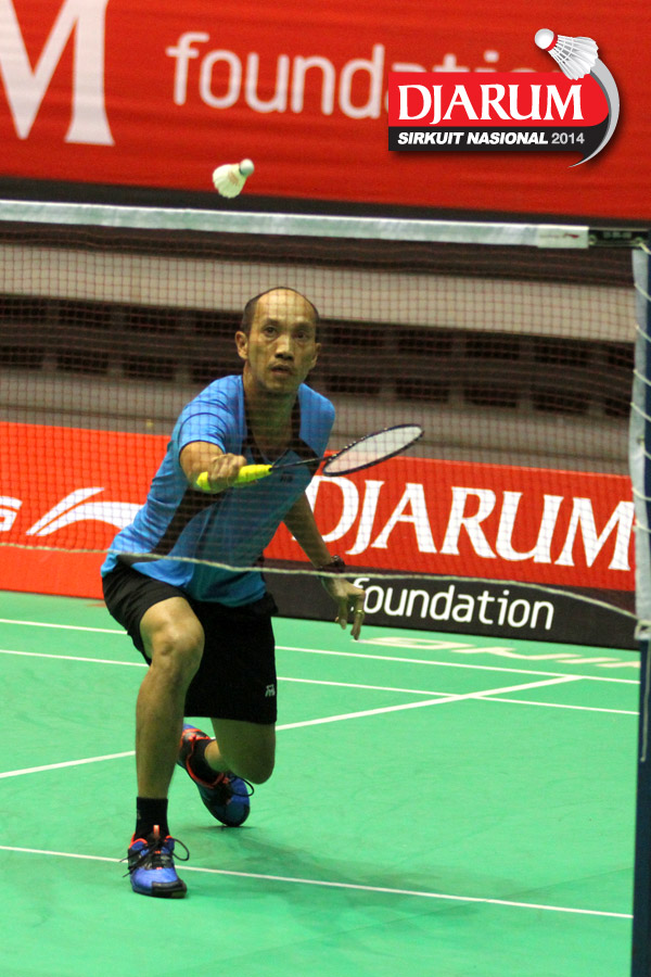 Jeffer Rosobin (Rosobin Academy) mengembalikan shuttlecock ke arah Gary Lam (Hi Qua Prima).