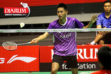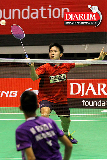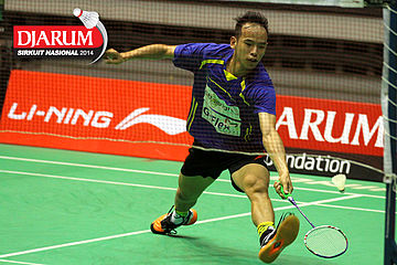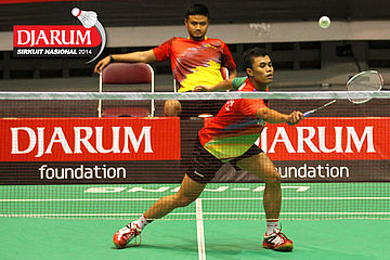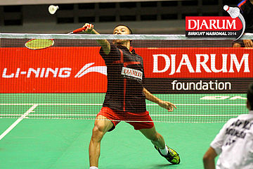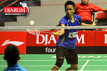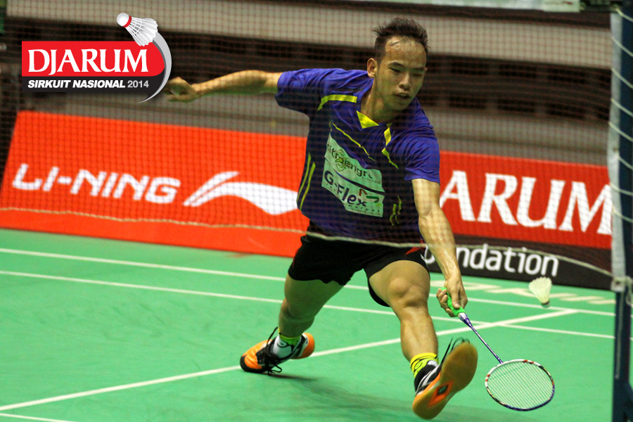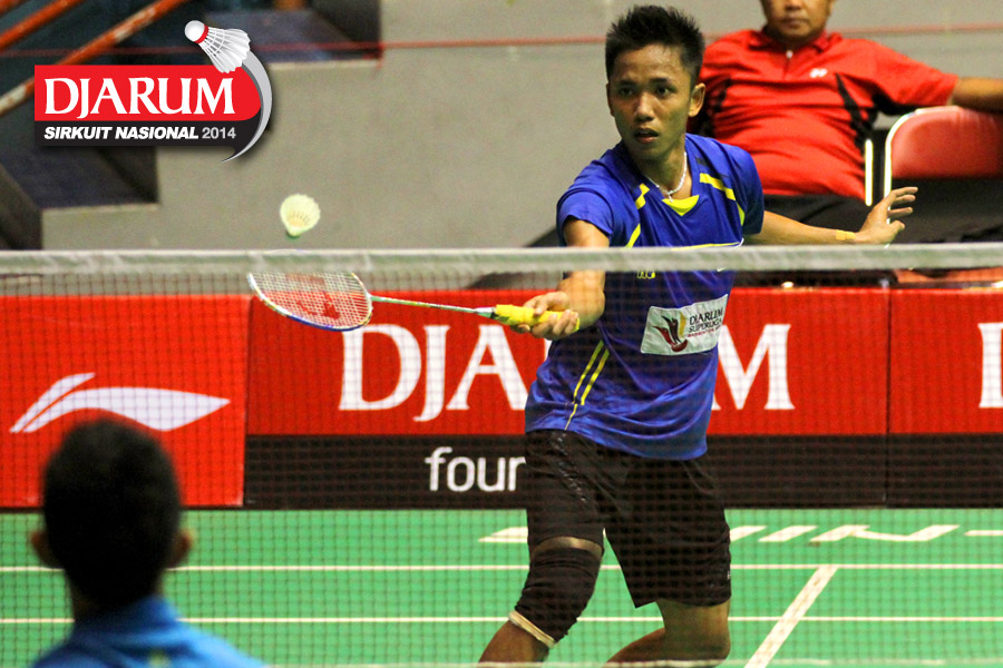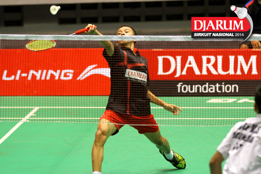 M. Zulkifli (PB Djarum) mengembalikan shuttlecock ke arah Arif Wahyu (Candra Wijaya).