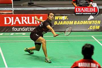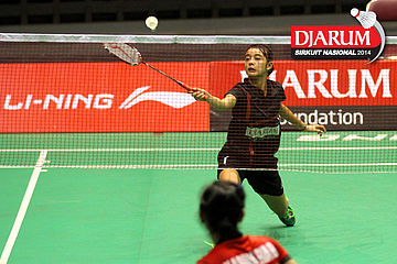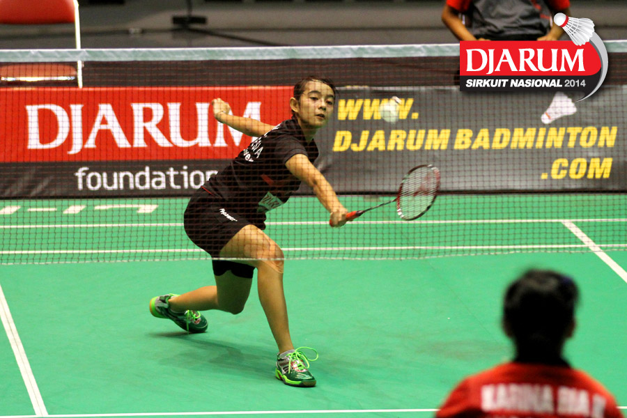 Silvi Wulandari (PB Djarum) mengembalikan shuttlecock ke arah Karina Ria (PB Djarum).