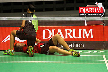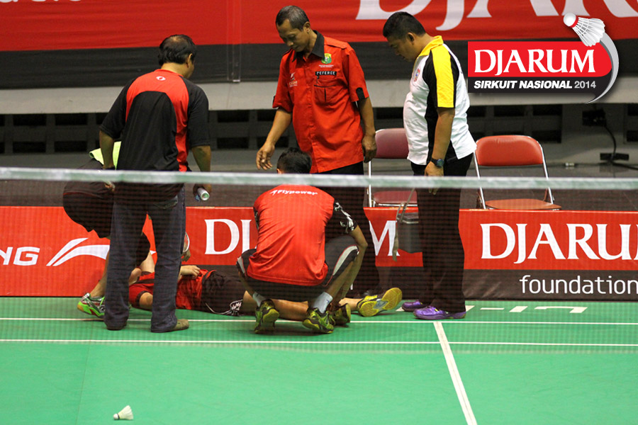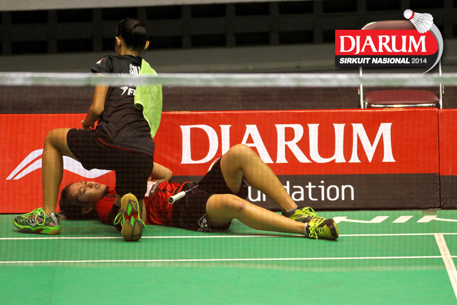Karina Ria (PB Djarum) saat mendapatkan pertolongan dari lawan yang merupakan rekan satu timnya, Silvi Wulandari (PB Djarum).