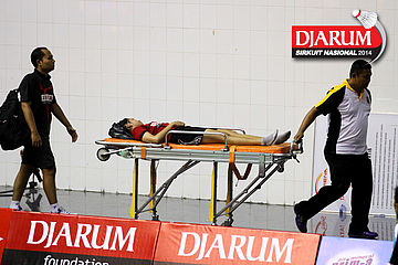 Karina Ria (PB Djarum) saat ditandu keluar lapangan untuk mendapatkan penangan medis.