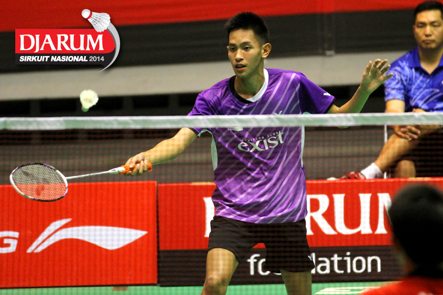 Eka Fajar Kusuma (Jaya Raya) mengembalikan shuttlecock ke arah Arif Gifar (PB Djarum).